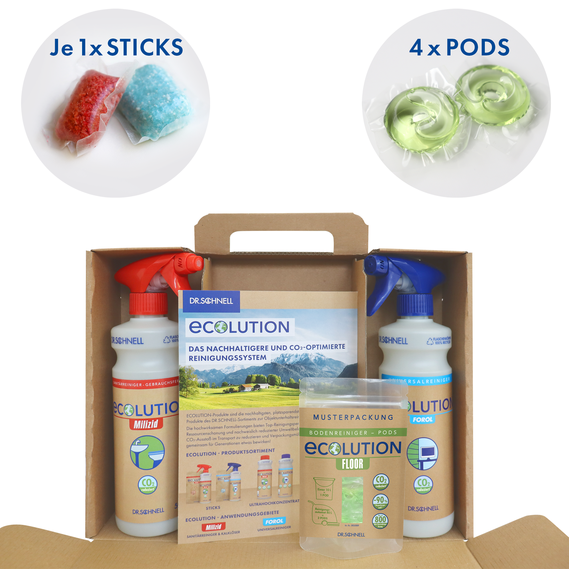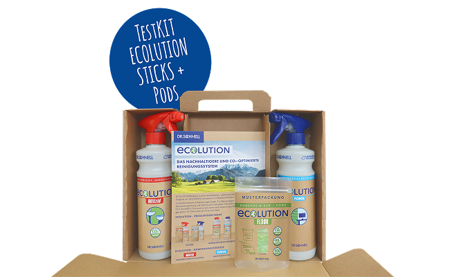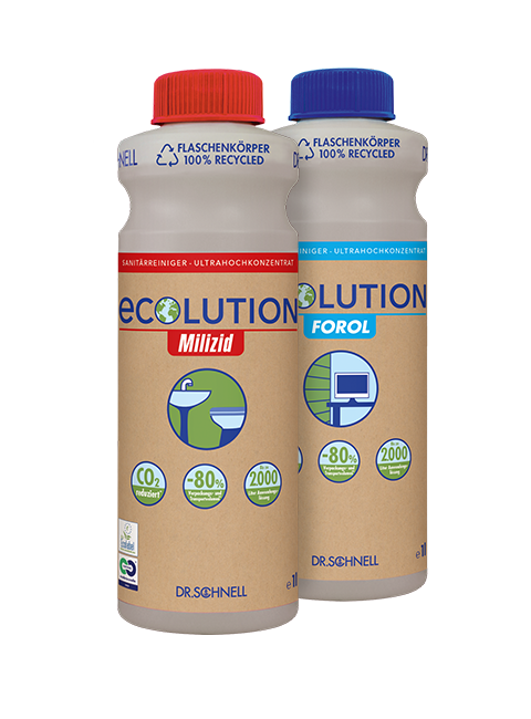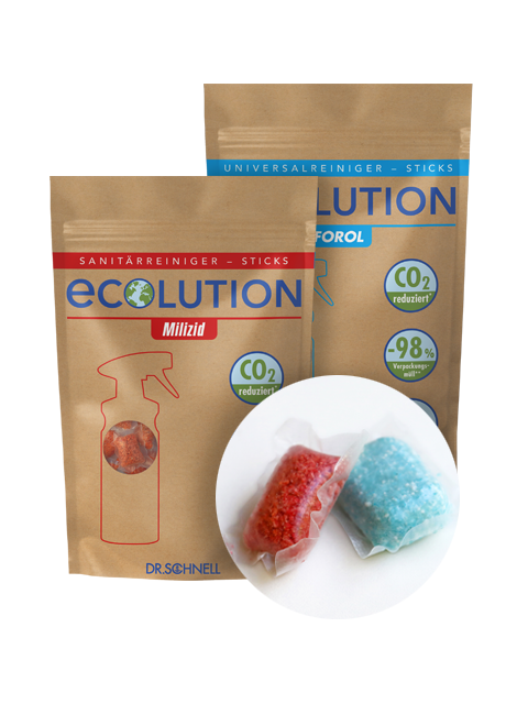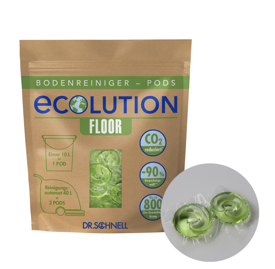 ECOLUTION-Produkte sind die nachhaltigsten, platzsparendsten und somit CO₂*-optimierten Produkte im DR.SCHNELL-Sortiment zur Objektunterhaltsreinigung. Die hochwirksame Formulierung führt zu einer Top-Reinigungsperformance bei gleichzeitiger Ressourcenschonung und nachweislich reduzierter Umweltbelastung. Helfen Sie mit, den CO₂*-Ausstoß im Transport zu reduzieren und Verpackungsmüll zu sparen. Lassen Sie uns gemeinsam für Generationen etwas bewirken!