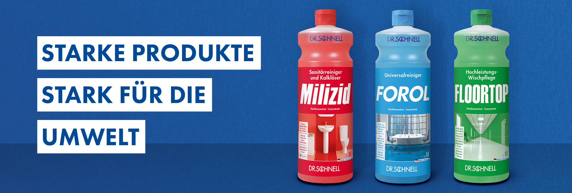 Die Starken 3 von DR.SCHNELL sind jetzt noch nachhaltiger. MILIZID, FOROL und FLOORTOP, die Allrounder für die Unterhaltsreinigung erscheinen brandneu in transparenten Flaschen und Kanistern aus Kunststoff mit einem Recyclatanteil von 30%.