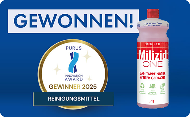 Zum zweiten Mal in Folge gewinnt DR.SCHNELL den renommierten Purus Innovation Award, die begehrteste Branchenauszeichnung ihrer Zeit, die während der Messe CMS in Berlin verliehen wird. Diesjähriger Preisträger in der Kategorie Reinigungsmittel ist der innovative Sanitärreiniger MILIZID ONE, den DR.SCHNELL als Weltneuheit auf der CMS 2025 vorstellt..