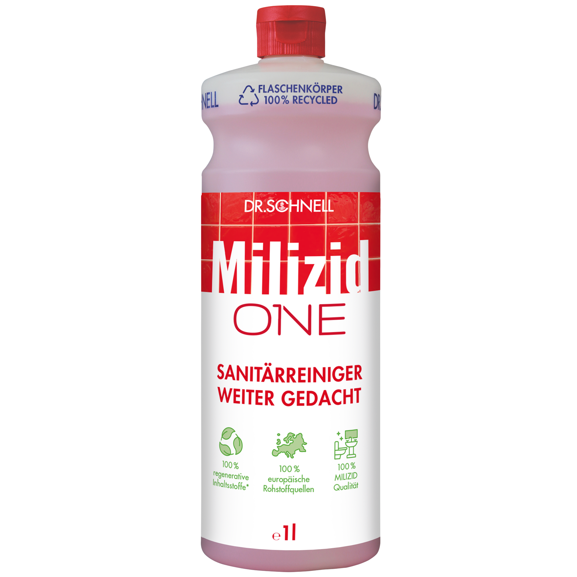 Der 100 % mit regenerativen Inhaltsstoffen* aus Europa hergestellte Sanitärreiniger MILIZID ONE ist für alle säurebeständigen Flächen im Santiär - und Nassbereich geeignet. Mittels aller Reinigungsverfahren anwendbar. *Anteilig gemäß ISCC plus Massebilanzansatz.